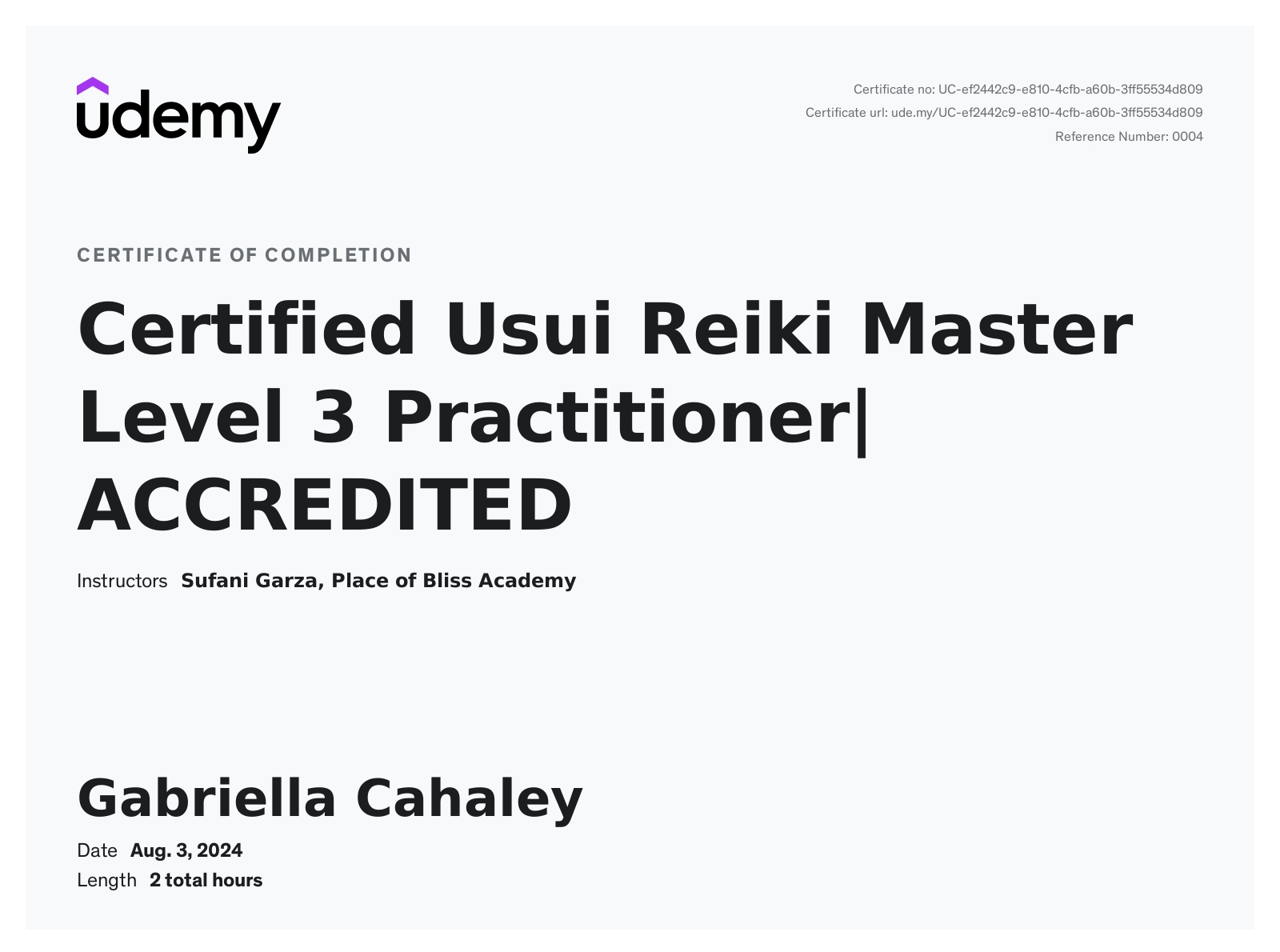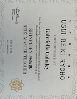 I had two Reiki treatments and was amazed by how calming and gentle it was. I noticed being peaceful at a time when I was undergoing life stresses. Recently, I became interested in taking Reiki courses. I am now a certified Practitioner and teacher of Reiki Levels 1, 2, 3 & Master Level. (Showing Certificate for Master Level). I profoundly grateful to my Master teachers Lisa Powers and Sufani Garza.